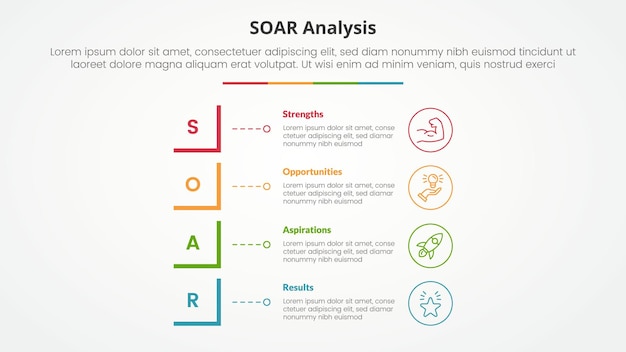 Soar analysis infographic concept for slide presentation with modified square shape vertical stack with 4 point list with flat style