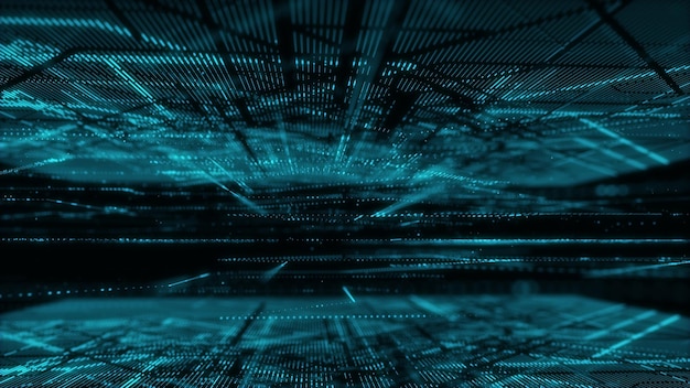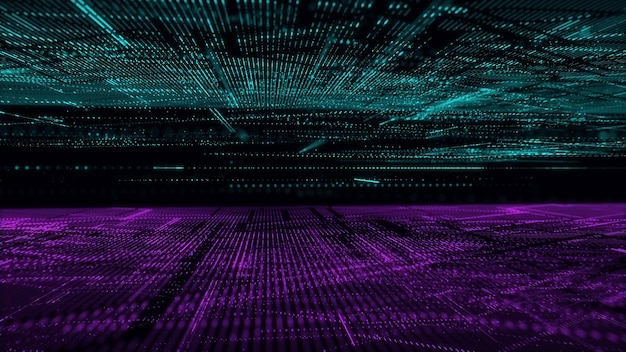 Digital database cyberspace decoding algorithms hacked software cyber security with moving particles big data visualization 3d rendering