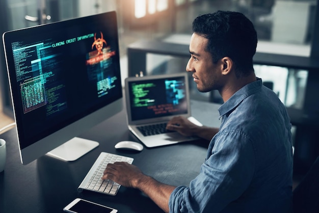 Programming error and man with cyber security typing and focus with digital software scam and finance male person programmer or coder with technology internet connection or analytics with fraud