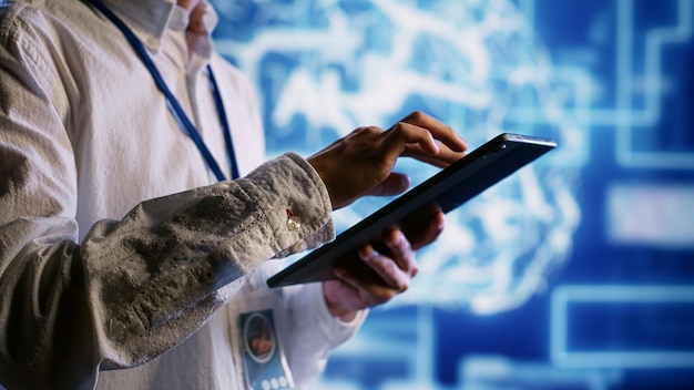 Qualified admin works with artificial intelligence computerized model simulating human brain. Proficient expert looks at ai visualization showing machine learning algorithms using pattern recognition