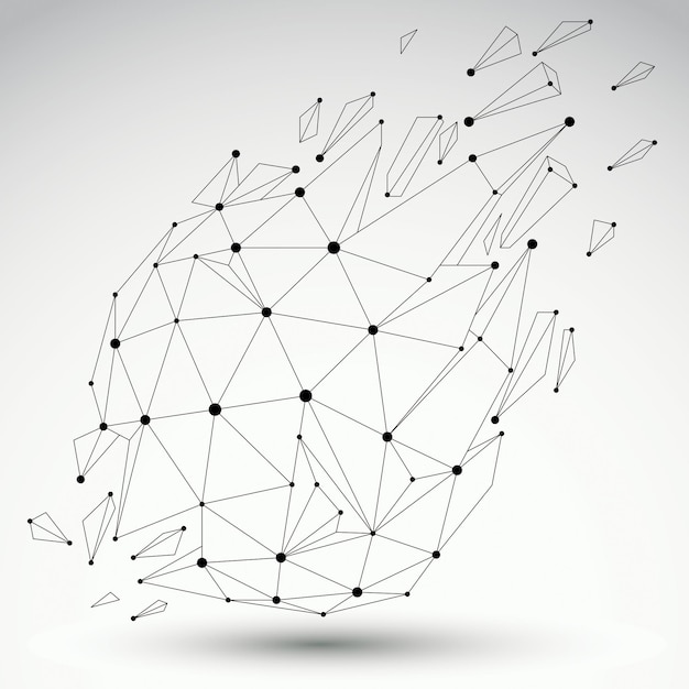 3d vector digital wireframe object broken into different particles and refractions, geometric polygonal structure with lines mesh. Low poly shattered shape, lattice form.