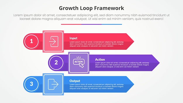 Growth loop framework infographic concept for slide presentation with table box and round header with 3 point list with flat style