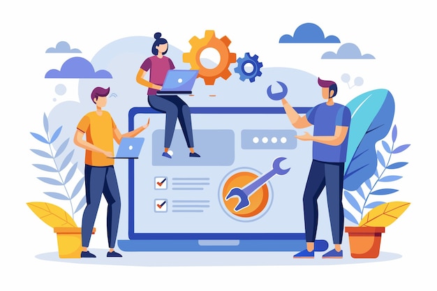 It administrator with software upgrade process on laptop. Digital system device administration, network upkeeping, computer systems configuration concept. System maintenance application vector.