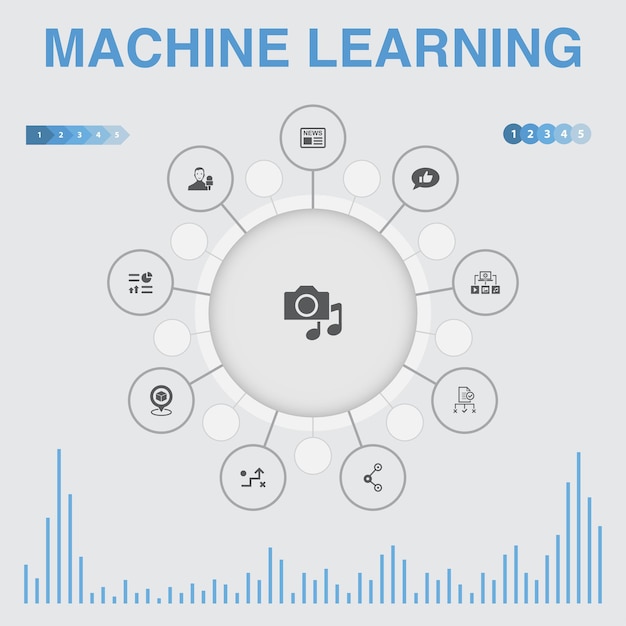 Machine learning concept, blue background.Data mining, algorithm, classification, ai icons