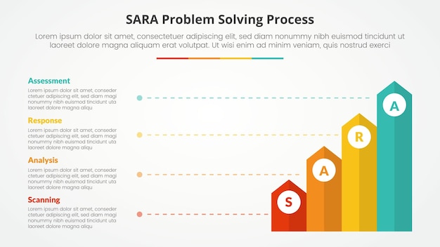 Sara model problem solving infographic concept for slide presentation with vertical rectangle arrow with line description with 4 point list with flat style