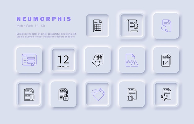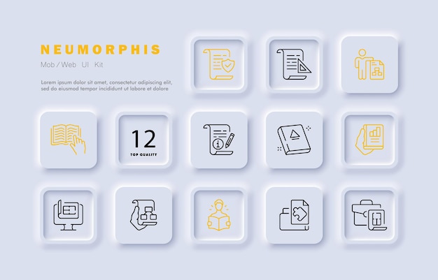 Working documentation set icon scroll book textbook statistics data comparison reading cv briefcase puzzle instruction file management information portfolio presentation neomorphism